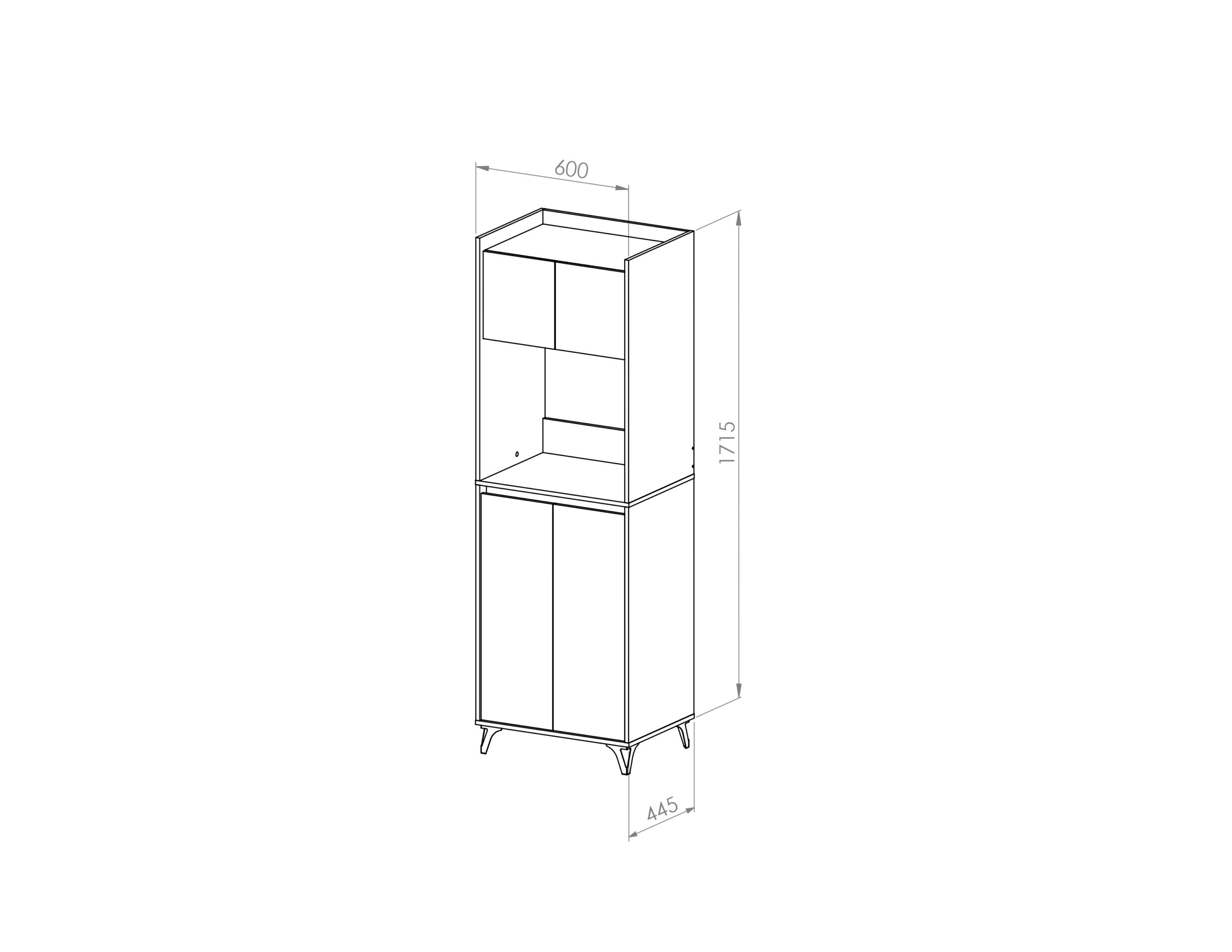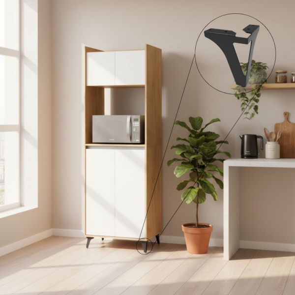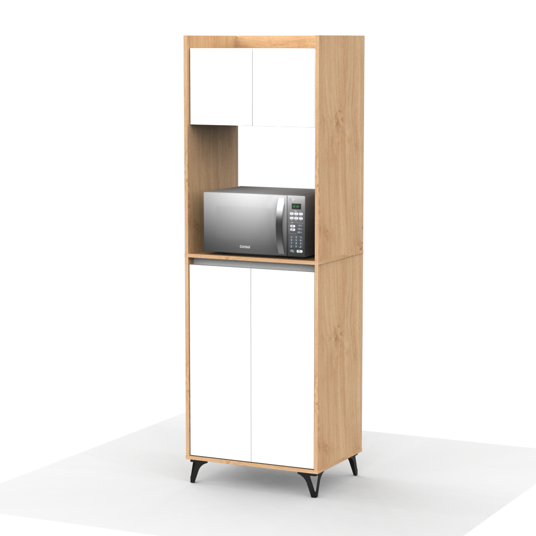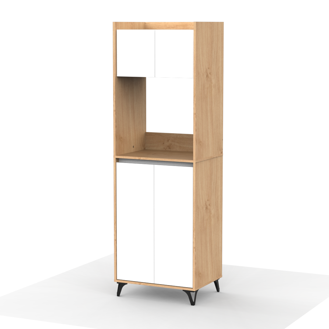 Este mueble auxiliar de cocina está fabricado en melamina de 15 mm, combinando estructura en tono madera con puertas blancas lisas. Cuenta con cuatro compartimientos: dos superiores y dos inferiores con puertas abatibles, ideales para almacenar vajilla, alimentos u otros utensilios. En el centro dispone de un espacio abierto para colocar un microondas u otros electrodomésticos. Se apoya sobre patas plásticas negras elevadas, que facilitan la limpieza y aportan un estilo moderno y funcional.