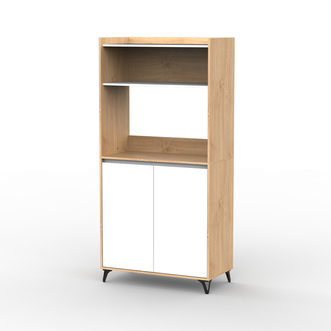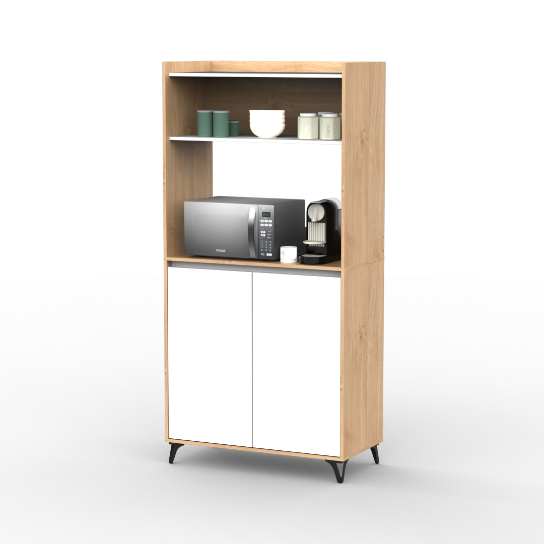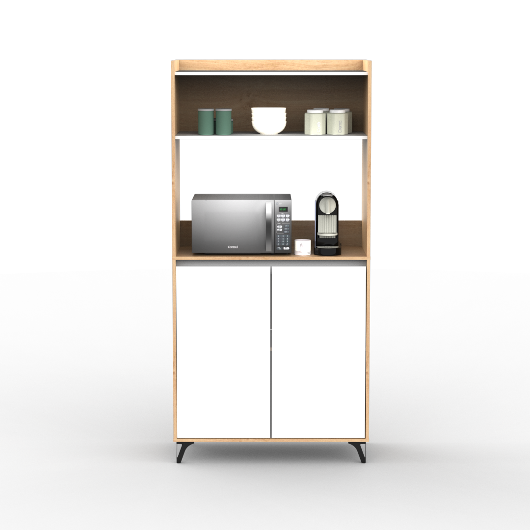 Mueble auxiliar de cocina fabricado en melamina de 15mm en combinación de color Kendal y Blanco. Ideal para apoyar microondas, freidora de aire u otros electrodomésticos, cuenta con doble puerta con estantes internos y una alzada para organizar vajilla, alimentos o utensilios. Su diseño moderno con patas elevadas aporta estilo y facilita la limpieza del piso, convirtiéndolo en una solución práctica y funcional para cualquier cocina.