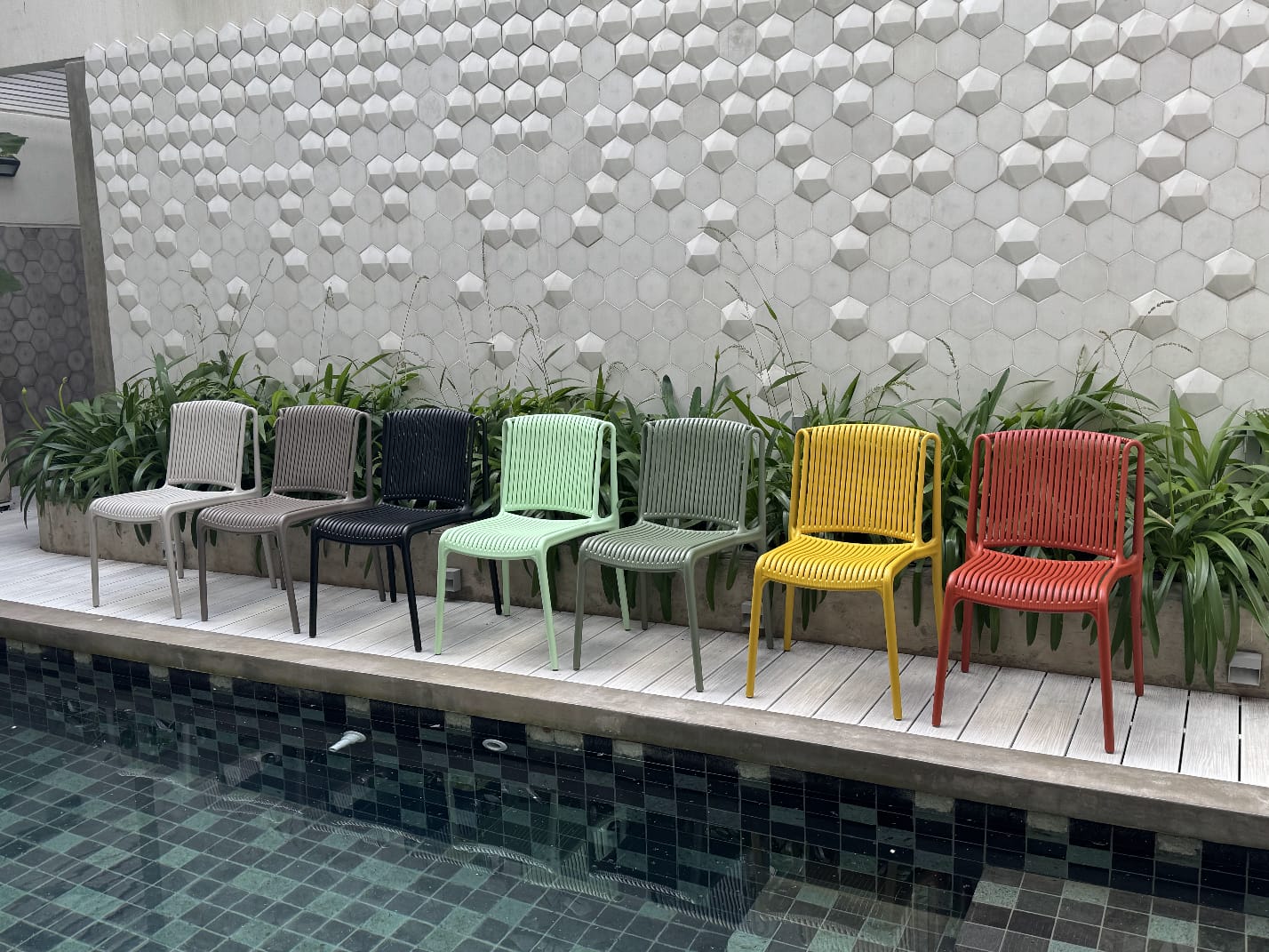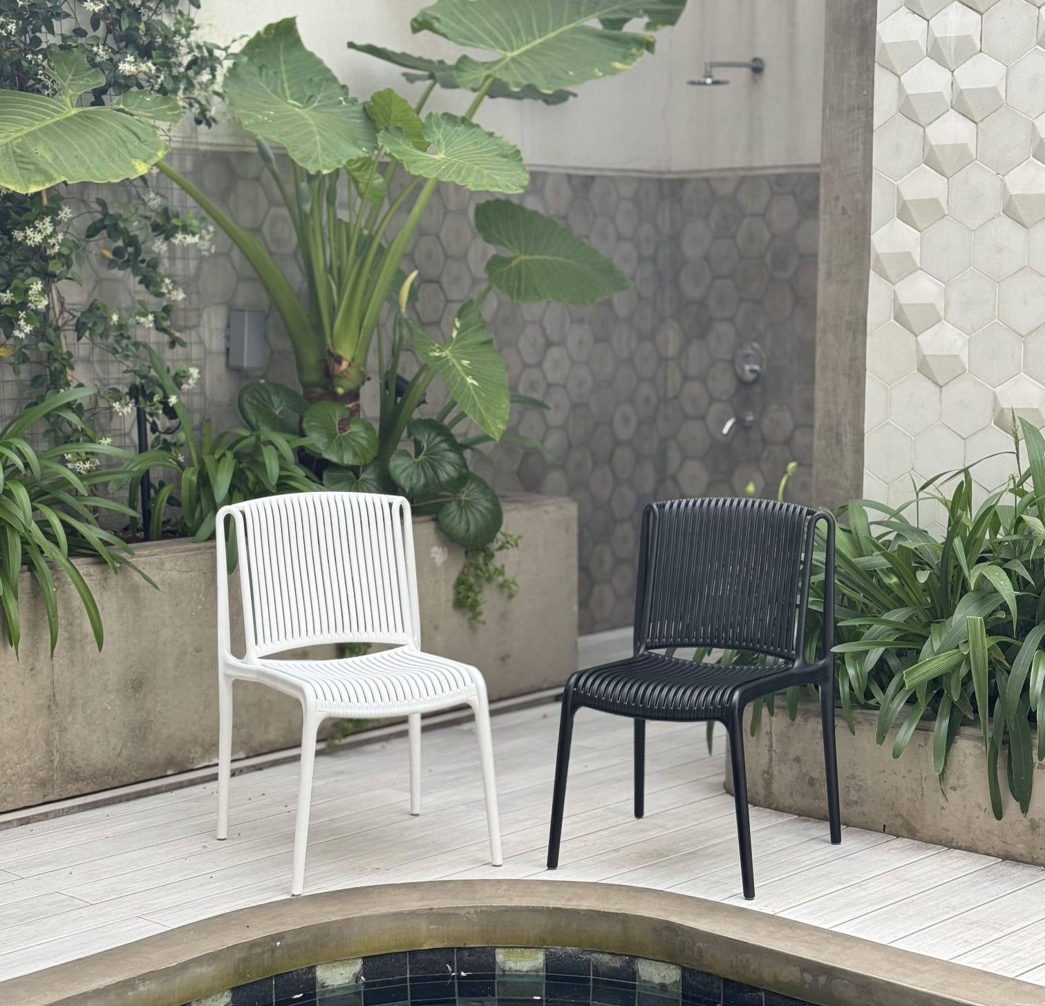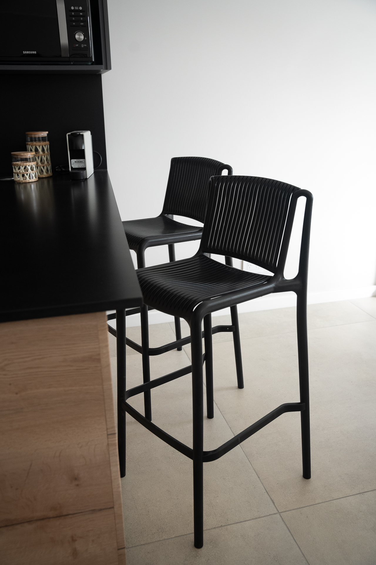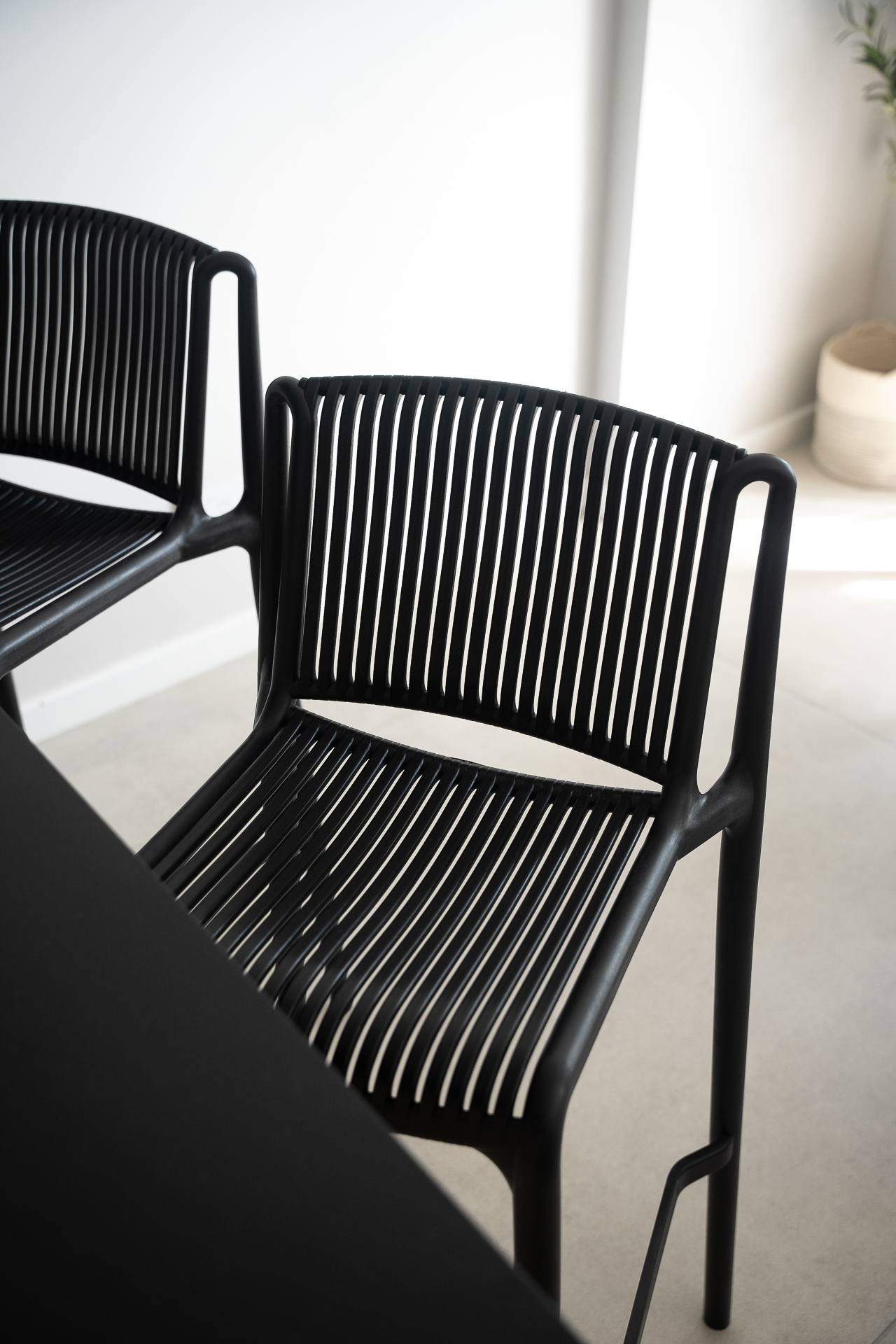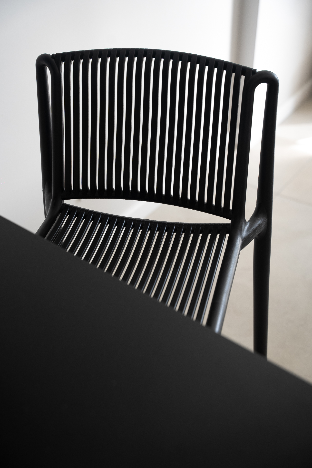 La banqueta Tokio, con un llamativo diseño de listones verticales en el asiento y respaldo, está fabricada con polipropileno reforzada con fibra de vidrio de alta durabilidad.