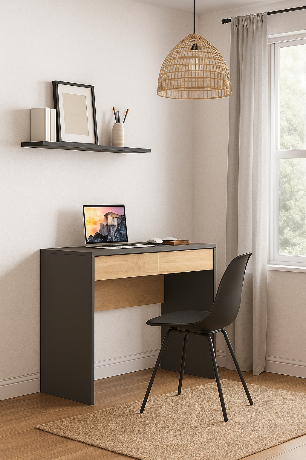 Este escritorio pequeño y elegante es la opción ideal para espacios reducidos, combinando un diseño moderno con funcionalidad. Destaca por su acabado único, que mezcla texturas de madera en veta con superficies lisas, creando un look sofisticado y contemporáneo. Cuenta con dos cajones, perfectos para mantener el orden y darle estilo a cualquier rincón de tu hogar o oficina.