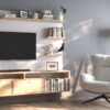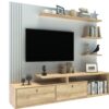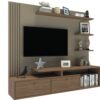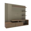 Home suspenso con 2 puertas basculantes, 4 estantes y tirador de cuero. Para TV de 50″. Incluye herrajes para colgar con terminación cromada. Fabricado con varillas de 15x25mm en MDF, placa MDP en 15 y 25 mm de espesor. Melamina texturada de alta calidad.