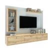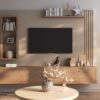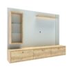 Home varillado con 3 puertas basculantes y 3 estantes (2 de vidrio). Pistón a gas y tiradores de cuero. Para TV de 60″. Incluye herrajes para colgar con terminación cromada. Fabricado con varillas de 15x25mm en MDF, placa MDP en 15 y 25 mm de espesor. Melamina texturada de alta calidad.