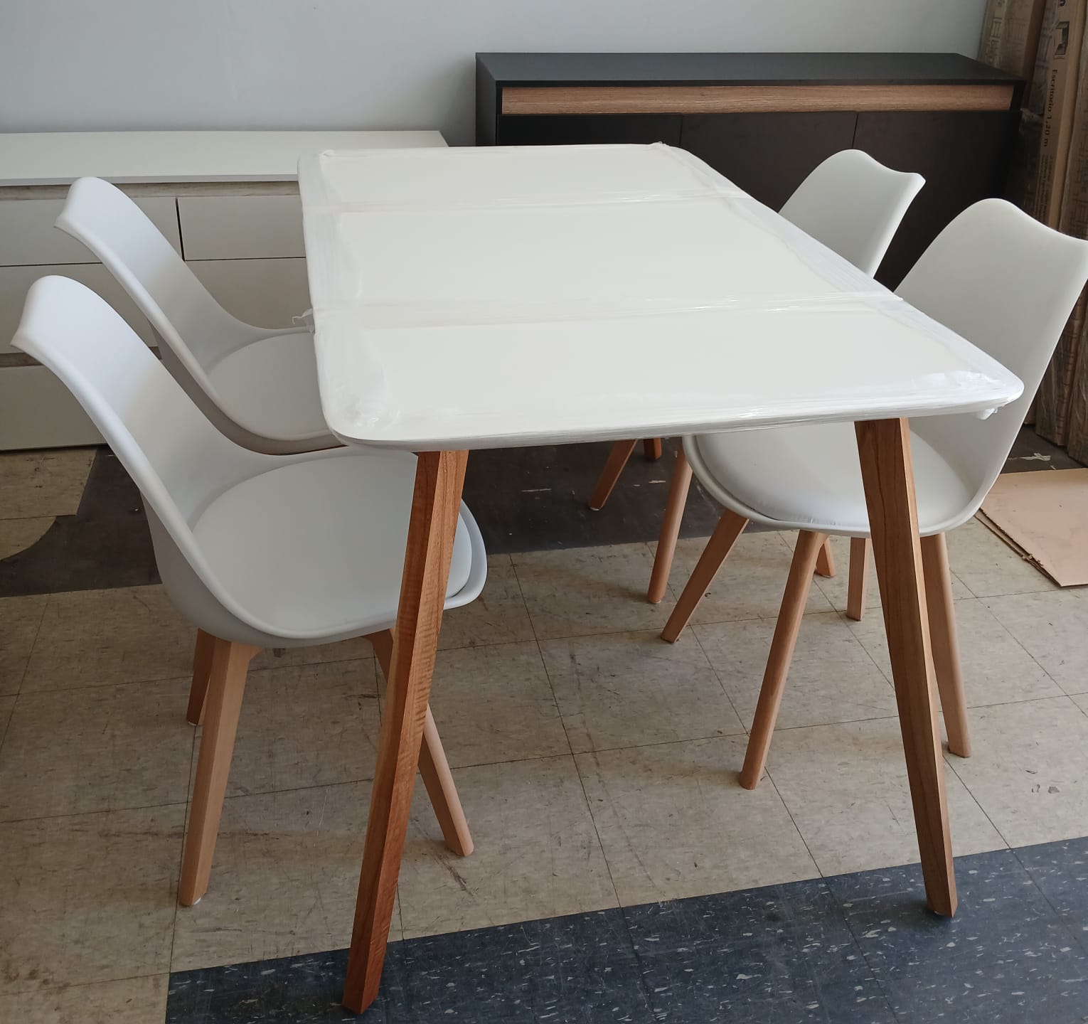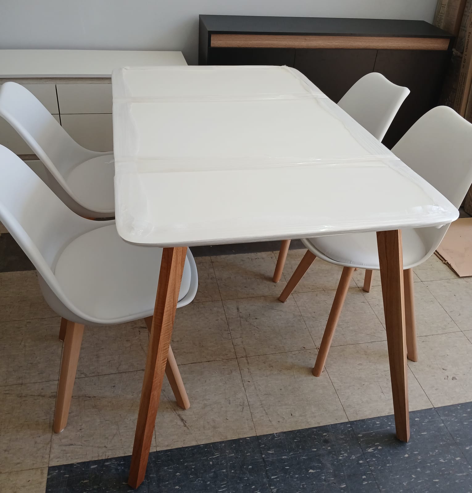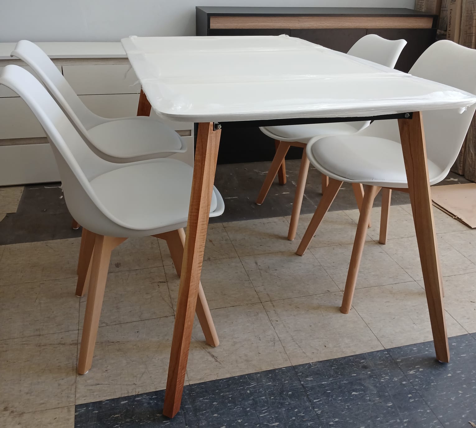 Mesa 1.30 x 80 cm tapa melamina con patas de paraiso + 4 sillas tulip casco plastico patas de madera.