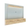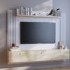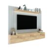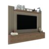 Panel varillado con 3 puertas basculantes, tiradores de cuero y estante. Para TV de 50″. Incluye herrajes para colgar terminación cromada. Fabricado con varillas de 15x25mm en MDF, placa MDP en 15 y 25 mm de espesor. Melamina texturada de alta calidad.